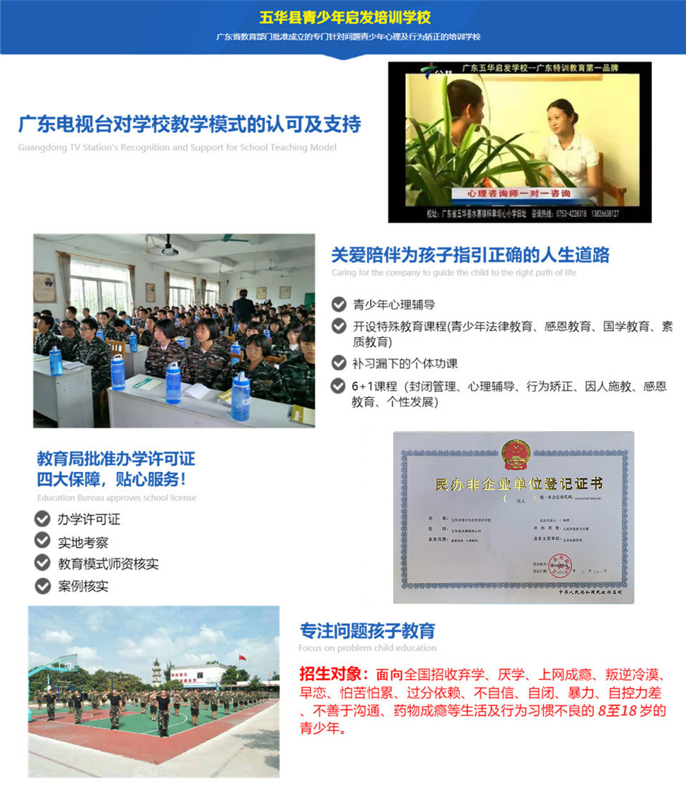 五华县青少年启发培训学校专门针对问题青少年心理及行为矫正的培训学校,是广东省青少年军校东莞启发训练营的延续。学校位于全国革命老区红色土地——梅州市五华县,占地面积2万平方米、建筑面积2千多平方米,校园环境优美、交通便利。是目前粤东地区一所针对问题青少年行为及心理进行矫正的培训学校,学校配有完善的教育培训设施和雄厚的师资力量以及优秀的管理人才,为需要帮助的问题青少年的成长保驾护航。