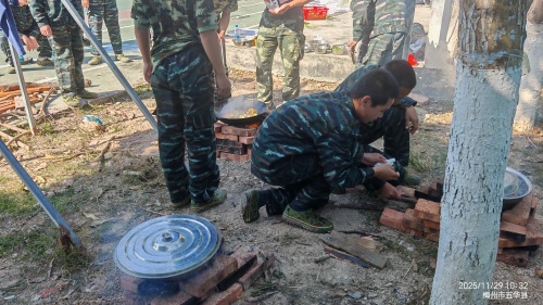 真正的考验开始了。 学员们以班排为单位,迅速行动起来。搭灶是第一步,垒砌出一个灶台来,考验着每个同学的动手能力和智慧。生火成了关键战役,吹气扇风、小心添柴,当灶膛里终于跃起第一簇火苗,人群中爆发出小小的欢呼。
