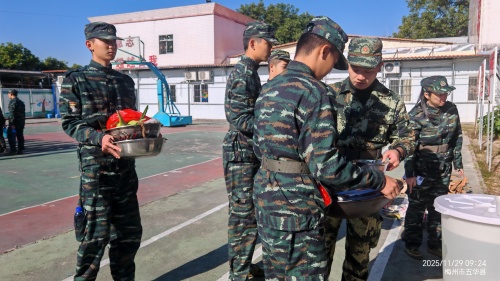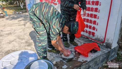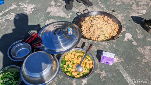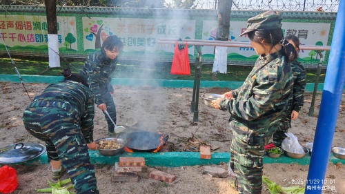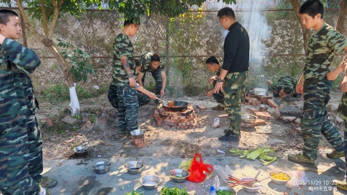 炊烟袅袅升起,操场化身为露天厨房。最富成就感的烹饪环节到了:米饭在简易锅中咕嘟着冒出香气,“厨师”们有模有样地挥动锅铲,青菜与肉片在高温下滋滋作响,交织成一曲生动的劳动乐章。虽然脸庞被烟火熏得微微发热,但那份专注与协作的神情,以及成功后洋溢的笑脸,成为最动人的画面。三个小时的实践让学员们收获了吃苦耐劳的精神和团队协作的默契。