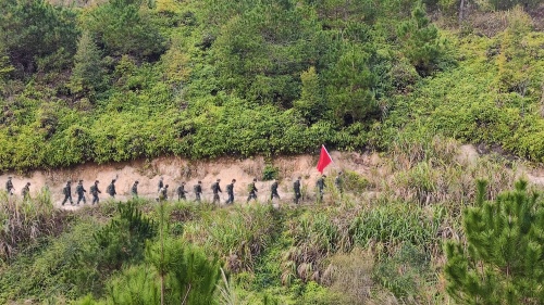 队伍按照预定路线从学校大门出发,踏上了前往附近山野的征程。山路蜿蜒,考验着每一位学员的体力与毅力;田野广阔,见证了他们的团结与坚持。这一路,不仅是对身体的锤炼,更是对精神的洗礼。 行军途中,学员们切身感受革命先烈不畏艰险、英勇顽强的拼搏精神,每一步都在激发着心中的爱国热情。