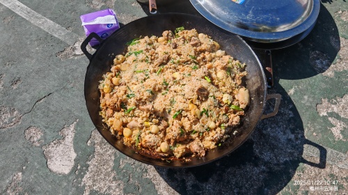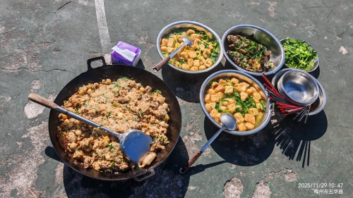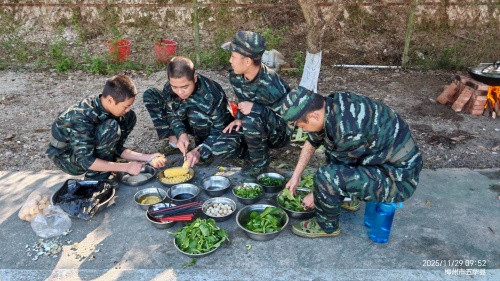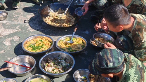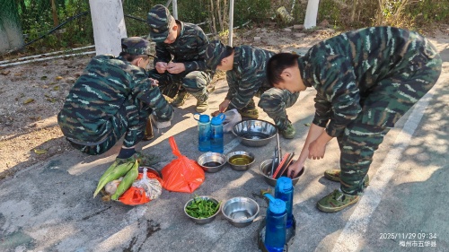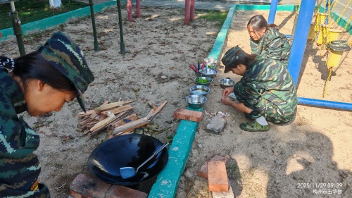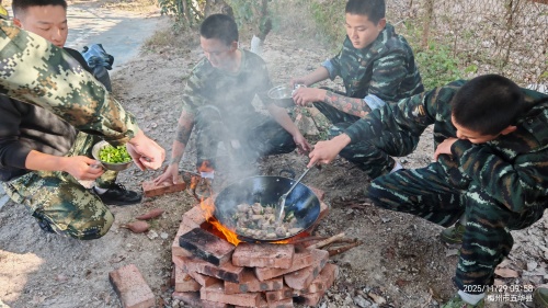 炊烟袅袅升起,操场化身为露天厨房。最富成就感的烹饪环节到了:米饭在简易锅中咕嘟着冒出香气,“厨师”们有模有样地挥动锅铲,青菜与肉片在高温下滋滋作响,交织成一曲生动的劳动乐章。虽然脸庞被烟火熏得微微发热,但那份专注与协作的神情,以及成功后洋溢的笑脸,成为最动人的画面。三个小时的实践让学员们收获了吃苦耐劳的精神和团队协作的默契。